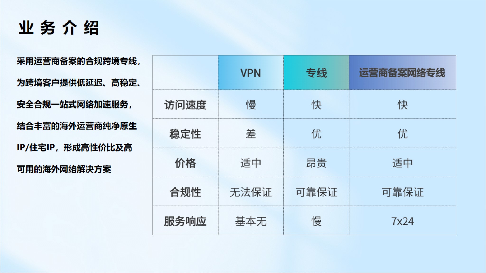 遵從運(yùn)營(yíng)商規(guī)則,采用運(yùn)營(yíng)商備案網(wǎng)絡(luò)專(zhuān)線,結(jié)合海外運(yùn)營(yíng)商純凈獨(dú)享原生IP,提供低延遲、高穩(wěn)定、安全合規(guī)的海外網(wǎng)絡(luò)服務(wù)